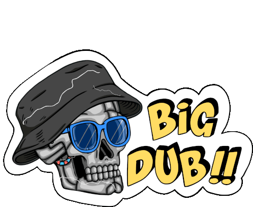 A cool animated sticker featuring a skull wearing a bucket hat and blue sunglasses, with the text 'Big DUB!!' and referencing Secret Skellies Society NFT.