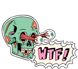 An animated cartoon skull from Secret Skellies Society with bulging eyes and the text 'wtf' expressing confusion.