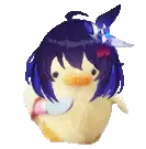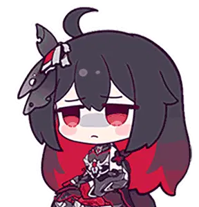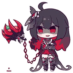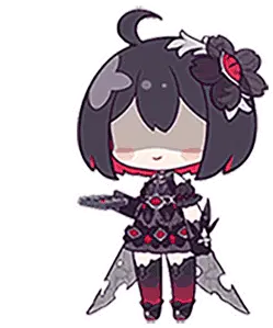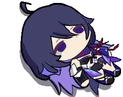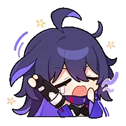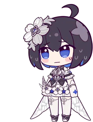 Chibi Seele from Honkai Impact changes her expression from tired to wide-eyed and surprised, wearing a white and blue dress.