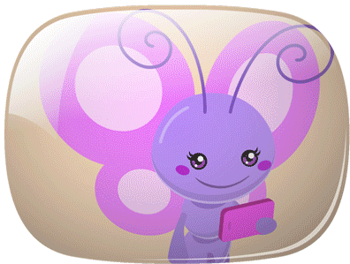 Cute purple and green butterfly characters taking playful selfies with a pink smartphone.