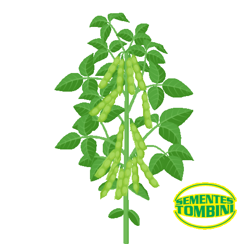 An animated sticker featuring a vibrant green soybean plant with pods, showcasing the Semente Tombini logo.