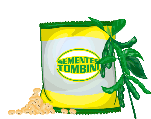 A vibrant yellow and green bag of 'Sementes Tombini' (Tombini Seeds) is depicted alongside a green soybean plant and loose soybeans.