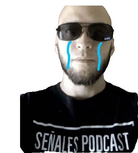 Man with sunglasses and drawn blue tears, wearing a 'Señales Podcast' shirt. Features Oscar, Pepe, and Warrenazo.