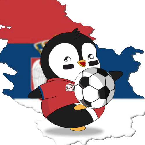 a cartoon penguin holding a soccer ball in front of a map of serbia