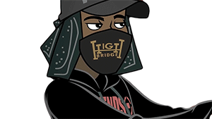 A Boogie Wit Da Hoodie cartoon character with a serious, angry expression, wearing a black cap and a mask with 'HIGH BRIDGE' logo.