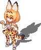 An animated pixel art sticker of Serval from Kemono Friends, featuring her iconic cat ears, tail, and spotted outfit.