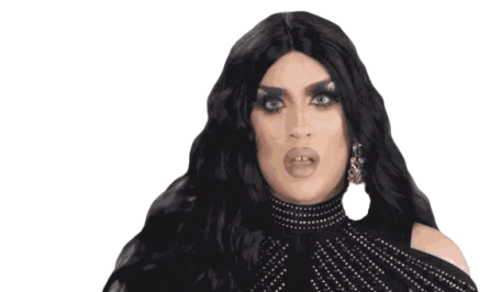 A drag queen with long dark hair and a sparkly outfit serves fierce looks.