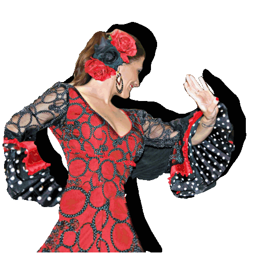 a woman in a red and black dress with polka dots on the sleeves