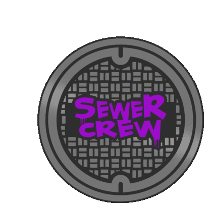 A round, grey manhole cover with the words 'SEWER CREW' written in vibrant purple, created by Twixnkat.