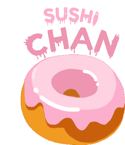 a donut with pink frosting and the words sushi chan written on it