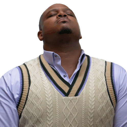Maurice Webb, wearing a sweater vest and blue shirt, shakes his head with an expression of disbelief or disapproval.