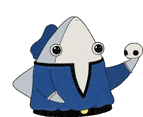 Veruella, the shark character, dressed as Hamlet, holding a skull and contemplating, with subtle blinks and mouth movements.