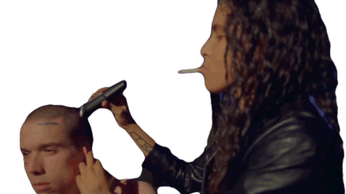 a woman shaves a man 's head with a tattoo on his forehead that says " freedom "