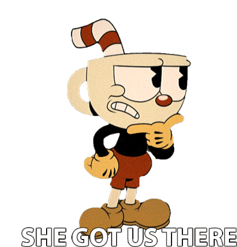 Cuphead stands thoughtfully with a hand on his chin, acknowledging the undeniable truth: "SHE GOT US THERE."