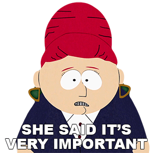 Sheila Broflovski from South Park exclaims 'She Said It's Very Important' with urgency.
