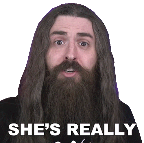 Samus Paulicelli expresses enthusiastic praise with the explicit phrase 'SHE'S REALLY FUCKING GOOD!' in this animated sticker.