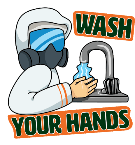 A person in a Shieldtec hazmat suit diligently washes hands under a faucet, emphasizing hygiene with 'WASH YOUR HANDS' text.