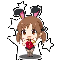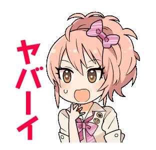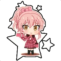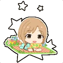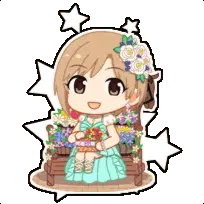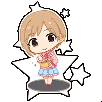 Ichinose Shiki from Idolmaster in a cute chibi sticker, enjoying a small snack with stars floating around her head.