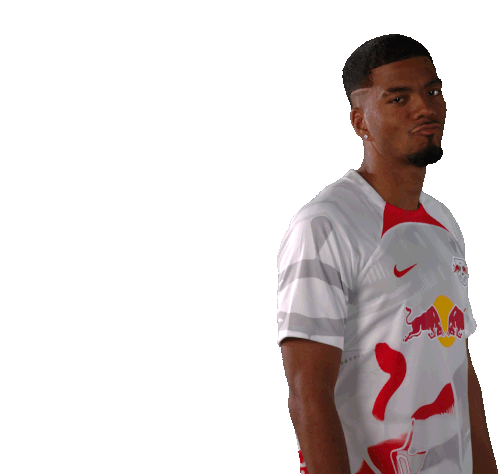 Benjamin Henrichs in a Red Bull jersey performs a playful shimmy dance move, looking up with a smirk.