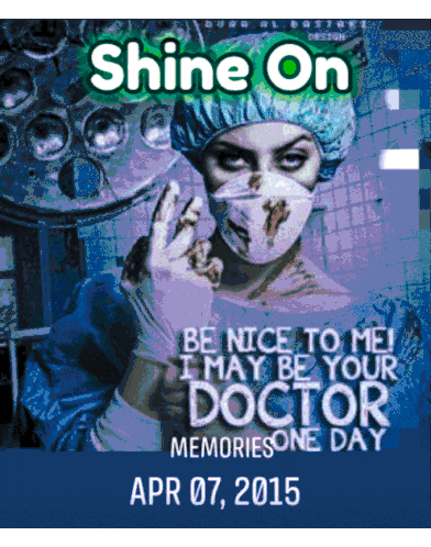 A surgeon in scrubs and mask with the text 'Shine On' and 'Be Nice To Me I May Be Your Doctor One Day'.
