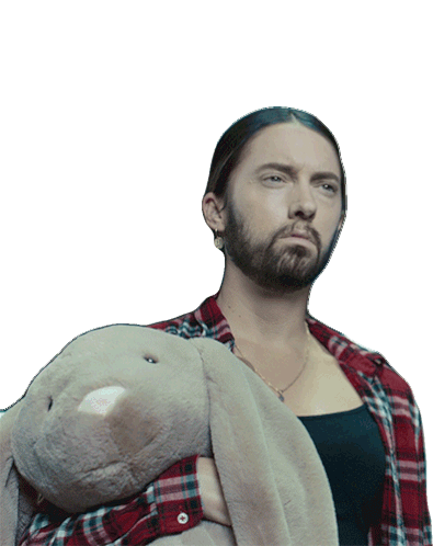 Eminem looks shocked and surprised, holding a stuffed bunny toy with his mouth open in disbelief.