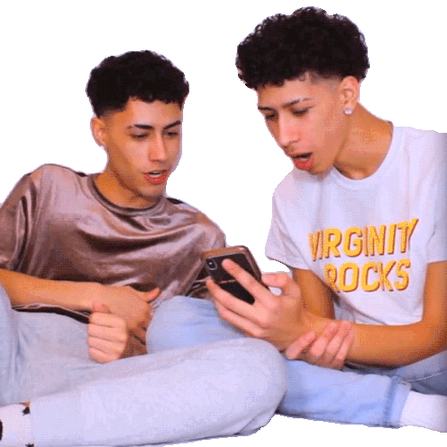 Giovanni Rivera and Elijah Rivera react with shock and surprise while looking at a phone, one covering his mouth.