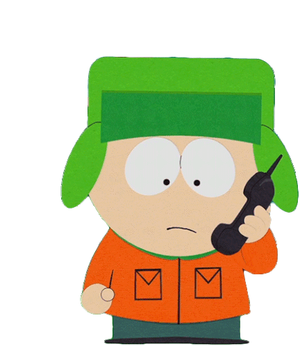 Kyle Broflovski, wearing his green hat, looks shocked while holding a phone to his ear, reacting to a call.