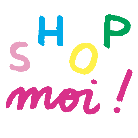 A vibrant animated sticker featuring the colorful text 'SHOP moi!' in a playful, handwritten style.