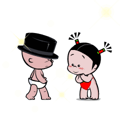 Pobaby characters, a boy in a top hat and a girl in a red bikini, joyfully dance with sparkling effects.