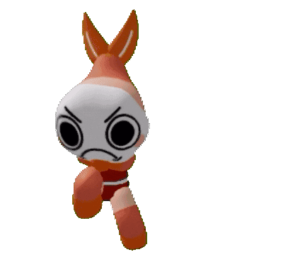 a stuffed animal with a white face and orange ears looks angry