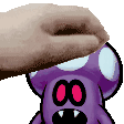 A hand gently pets a purple Shroob from the Mario & Luigi: Partners in Time game, showing its unique design.