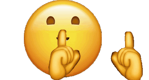 A yellow emoji face with small eyes and mouth makes a 'shush' gesture with both index fingers pointing upwards.