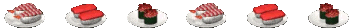 A blurred image of Japanese shushi or shushimi on a plate, likely from a conveyor belt restaurant, featuring red-topped food.