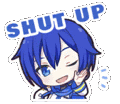 a sticker of a boy with blue hair and the words `` shut up '' on it .