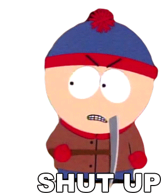 Stan Marsh from South Park, looking angry and holding a knife, tells someone to 'SHUT UP'.