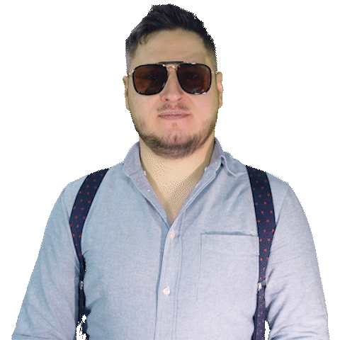 A man wearing sunglasses and suspenders giggles shyly with a happy and amused expression.