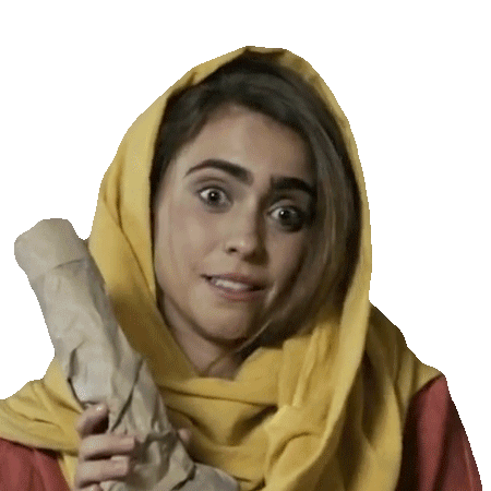 A woman in a yellow headscarf holds a crumpled paper, her expression shifting from surprise to a knowing smile.