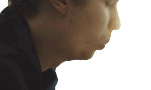 A man with curly hair sighs deeply, exhaling slowly, appearing exhausted and seeking relief.