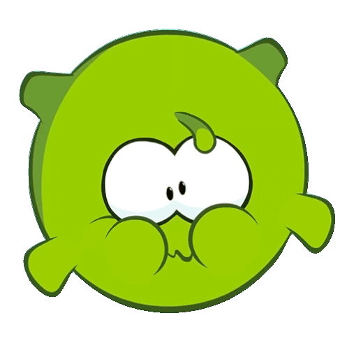 Om Nom sighs with relief, his cheeks puffing out and deflating in a cute, animated expression.