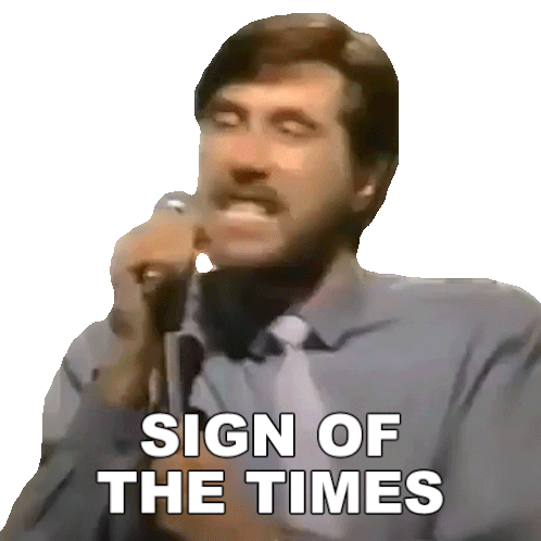 Bryan Ferry sings into a microphone with 'SIGN OF THE TIMES' text overlay, capturing an iconic moment.
