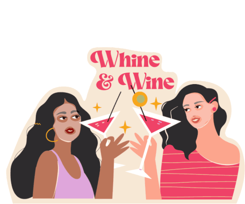 Two women toast with martini glasses under 'Whine & Wine' text, celebrating a girls' night out with a glow-up vibe.
