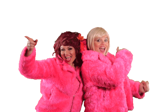 Two women in vibrant pink fur coats celebrating energetically, perfect for a Sjansee Carnaval party or festive occasion.