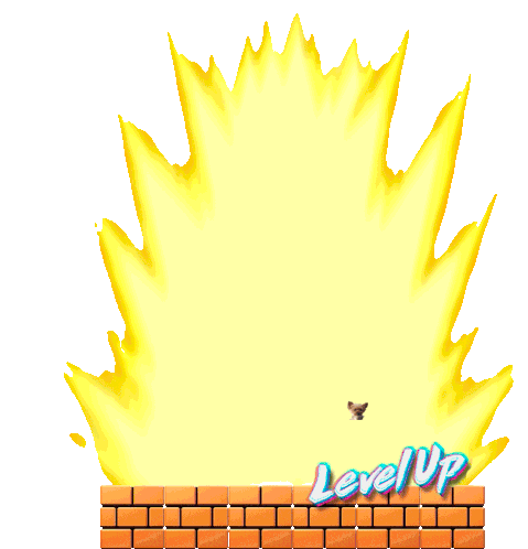 A cute Sk Rental Mascotas dog, possibly a Yorkshire Terrier, powers up with a yellow aura and "Level Up" text.