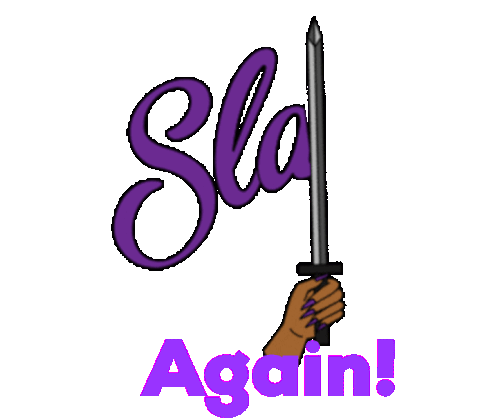 Animated sticker featuring a stylized hand gripping a sword, with the bold purple text "Slay Again!" surrounded by sparkling stars.