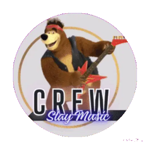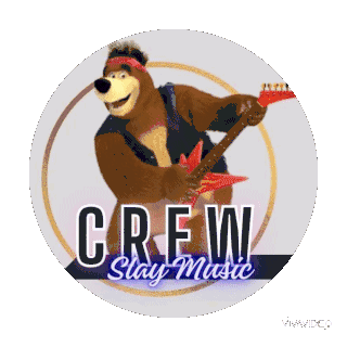 An animated sticker featuring a cartoon bear playing a red electric guitar with "CREW Slay Music" text.