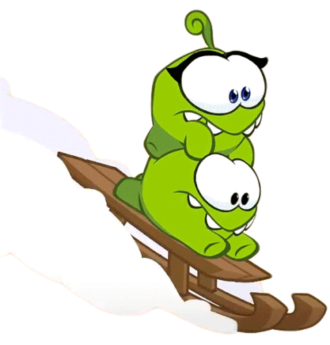 Om Nom and a friend from Cut The Rope joyfully sled down a snowy hill, laughing and having winter fun.
