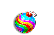 A vibrant rainbow-patterned bomb explodes into colorful particles, representing Slot Dana Mustikaslot.