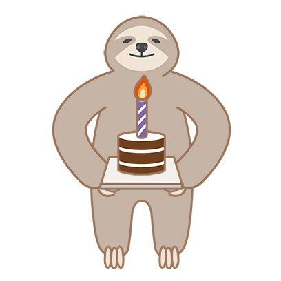 A cute cartoon sloth with a big smile holds a small chocolate birthday cake topped with a lit candle, perfect for celebrations.