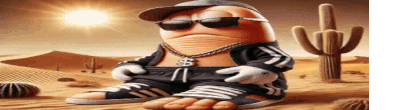 Slox Qanqstar, a cool potato-like character, poses in a desert wearing sunglasses, a cap, and a track suit.