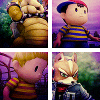 Animated sticker featuring Super Smash Bros. characters Bowser, Ness, Lucas, and Fox McCloud blinking and changing expressions.